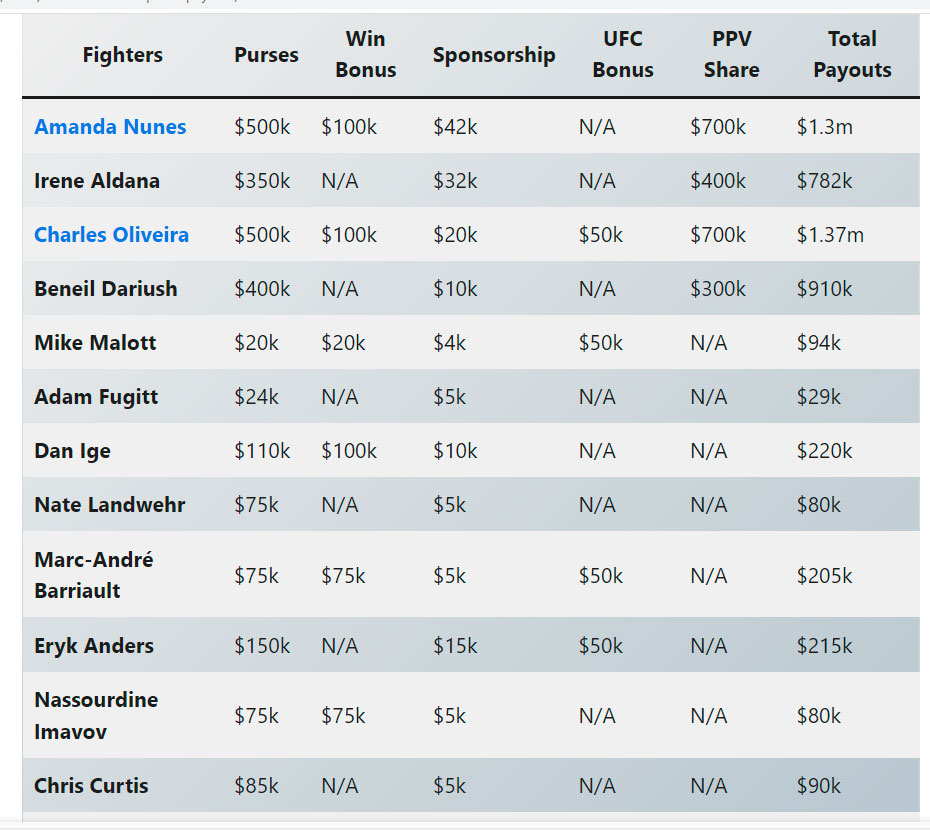 Por su parte, Charles Oliveira parece haber sido el mayor beneficiado del UFC 289. Su salario base, bonus por ganar y los PPV eran los mismo que Nunes, pero Charles ganó un poco más que Amanda según el reporte, ya que la suma total es de 1.370.00 millones de dólares. Esto se debió al bonus de pelea de la noche que ‘Do Bronx’ ganó.