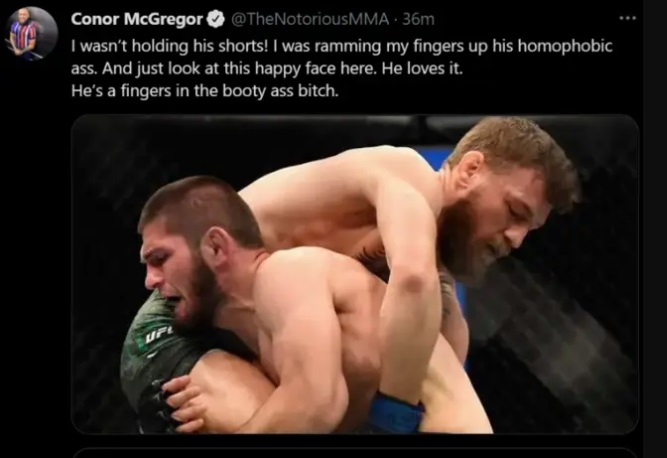 McGregor no terminó allí, ya que continuó disparando contra el ex rey del peso ligero de la UFC al tildarlo de “homofóbico” al responder a las acusaciones de trampa durante su enfrentamiento de 2018. En otro tuit, añadió: