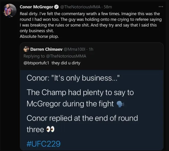 En el transcurso de la pelea entre Khabib Nurmagomedov y Conor McGregor se escucha a ‘The Eagle’ decir “hablemos ahora” mientras golpea a ‘The Notorious’, el irlandés en algún momento de la pelea, cuando termina el round, parece responder a su rival. Meses después, varios medios de comunicación y el mismo Nurmagomedov informaron que McGregor intentó calmar a su oponente quién decía “Ahora si hablemos” mientras lo golpeaba, afirmando que sus actos previos a la pelea pelea eran “sólo negocios”.