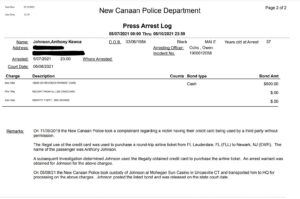 “El 09/11/2019, la policía de New Canaan tomó una denuncia en relación con una víctima que tenía su tarjeta de crédito siendo utilizada por un tercero sin permiso”, declaró la policía de New Canaan en el registro de arresto de Johnson