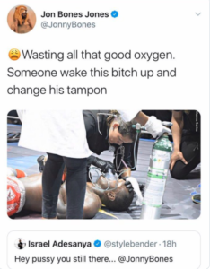 Jones también puso otro tweet en el que manifestó que las personas lo criticaban por tener problemas, caer y volver a levantarse, pero que nunca le reconocían cuando hacía cosas buenas o donaba dinero para las comunidades. A esto, Israel volvió a atacar al campeón de los semicompletos de las UFC.