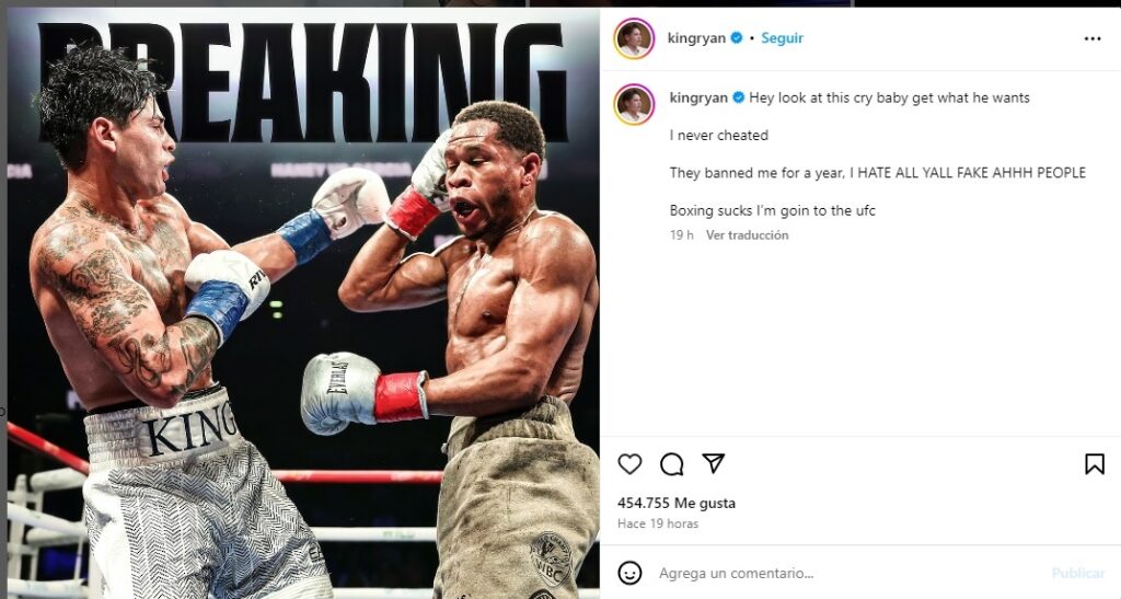 Ryan García está muy molesto y anunció que se irá a la UFC después de que su carrera en el boxeo se haya suspendido durante un año.