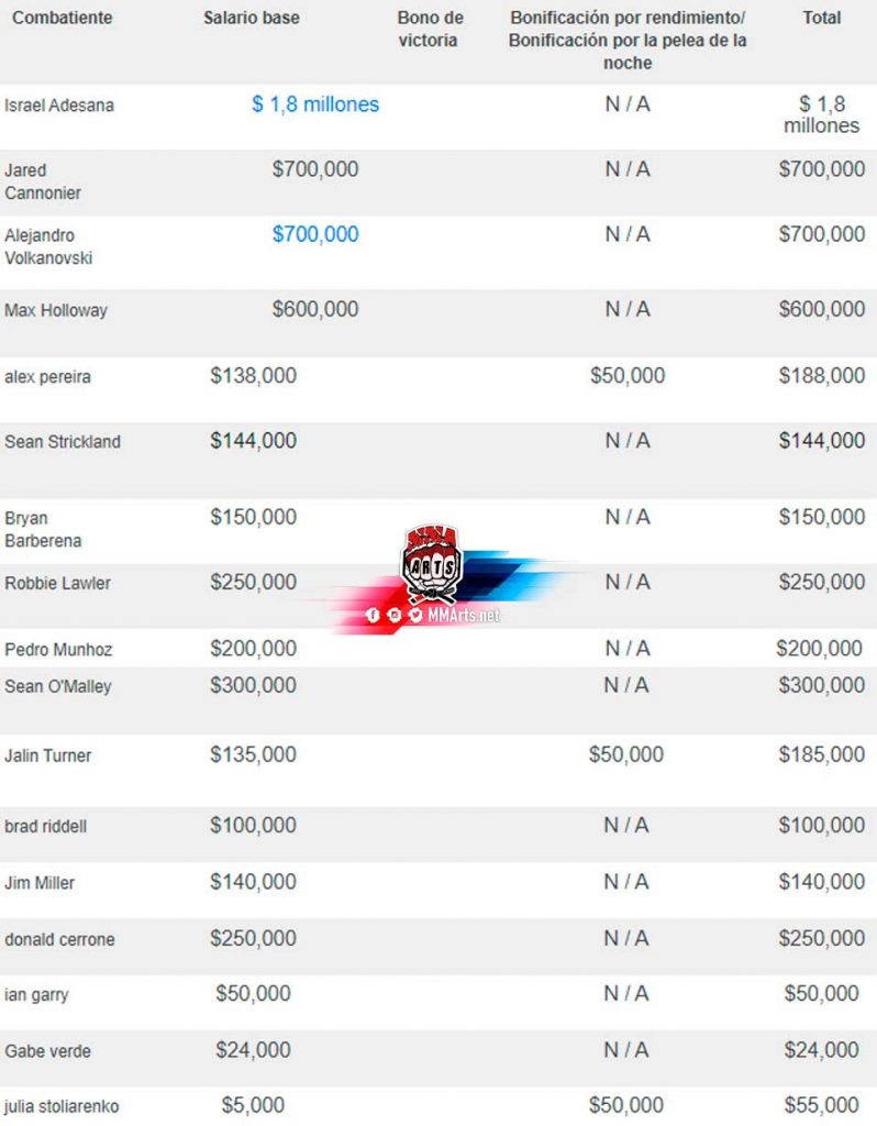 Tras el evento, se dieron a conocer los bonus de peleas y también algunos datos sobre los salarios de los peleadores, en los cuales Israel Adesanya fue el más beneficiado.