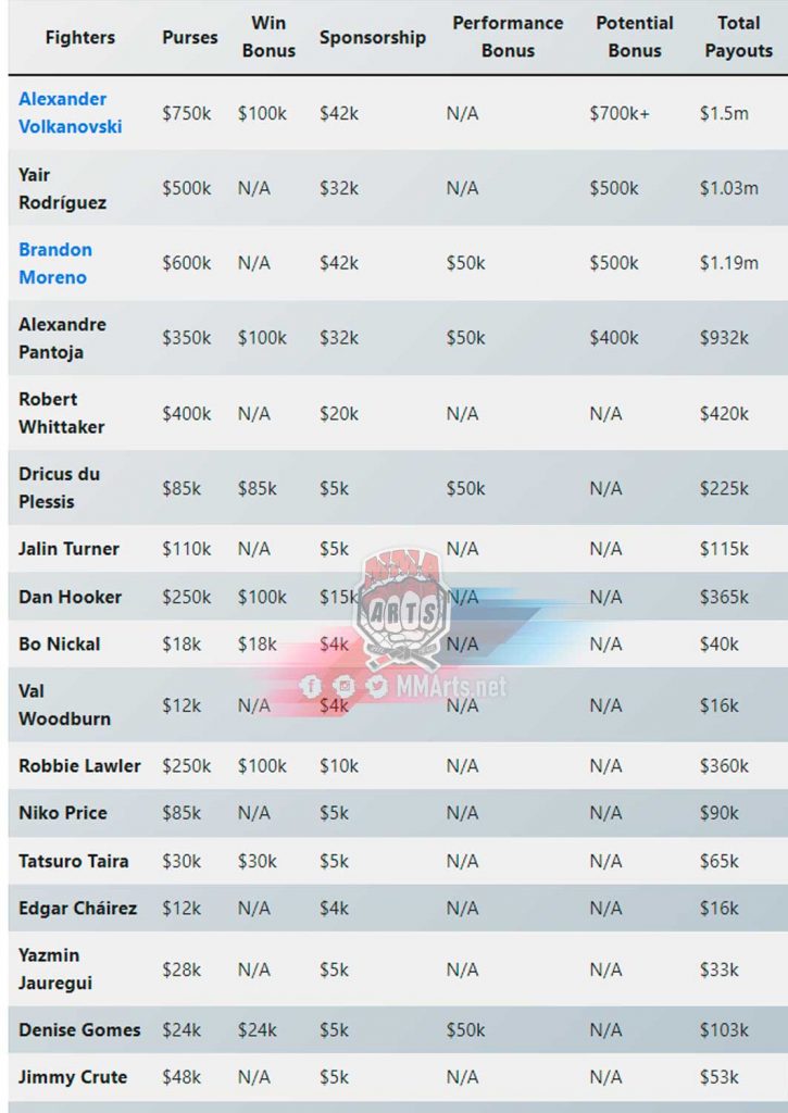 Sin embargo, Volkanovski, Rodríguez y Moreno fueron los peleadores con mejor pago para este evento. Volkanovski con un total de $1.5 m, Rodríguez con $1.03 m y Moreno, que también se llevó el premio de pelea de la noche, suma un total de $1.19 m. Después de que terminara el evento, la UFC dio conocer a los peleadores recompensados con el bono por ‘actuación de la noche’. Siendo Denise Gomes y Dricus de Plessis los que recibieron los $50.000 como recompensa por sus respectivas actuaciones.