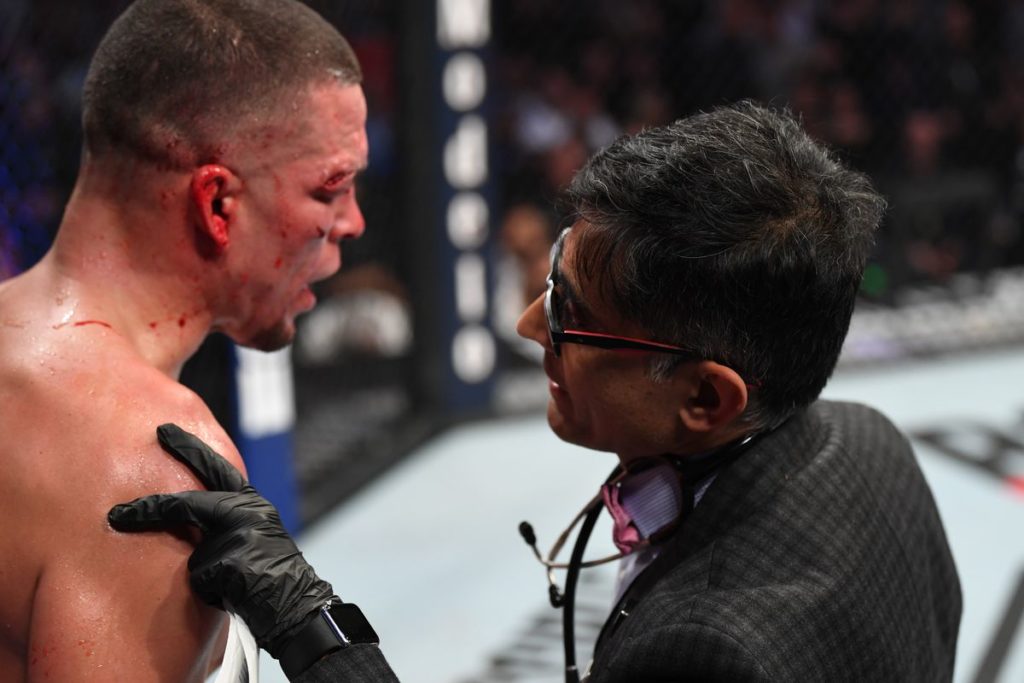 El médico Nitin K. Sethi, quien declaró que Nate Diaz no podía continuar en la pelea ante Jorge Masvidal en...