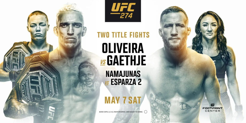 Phoenix, Arizona, será testigo de Charles Oliveira y su segunda defensa campeonato contra de Justin Gaethje, pero también se vivirá la revancha titular de Rose Namajunas y Carla Esparza, por lo que la empresa presentará por vez consecutiva eventos con dos campeonatos en juego, ya que en el UFC 273 también hubo dos peleas por el título.